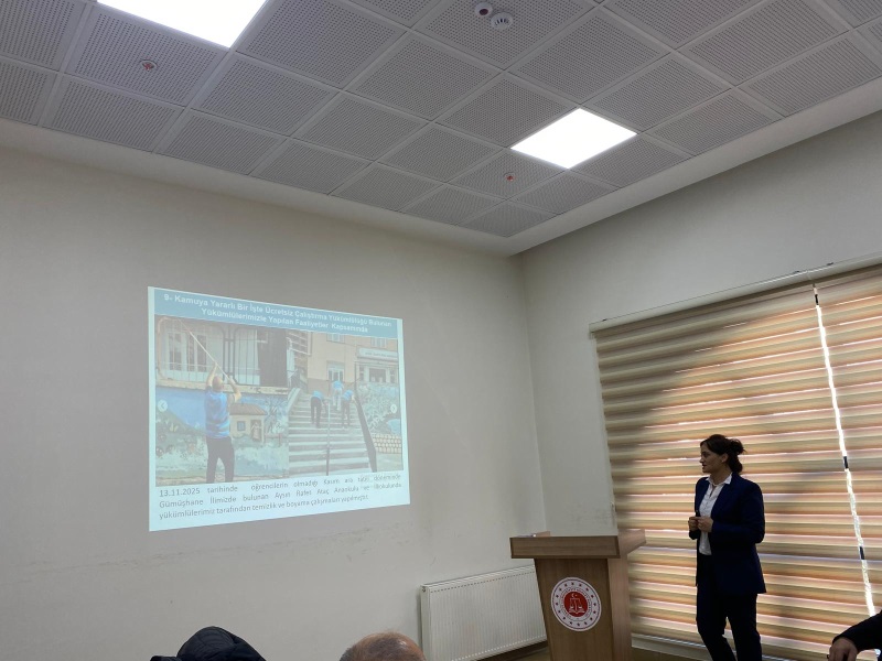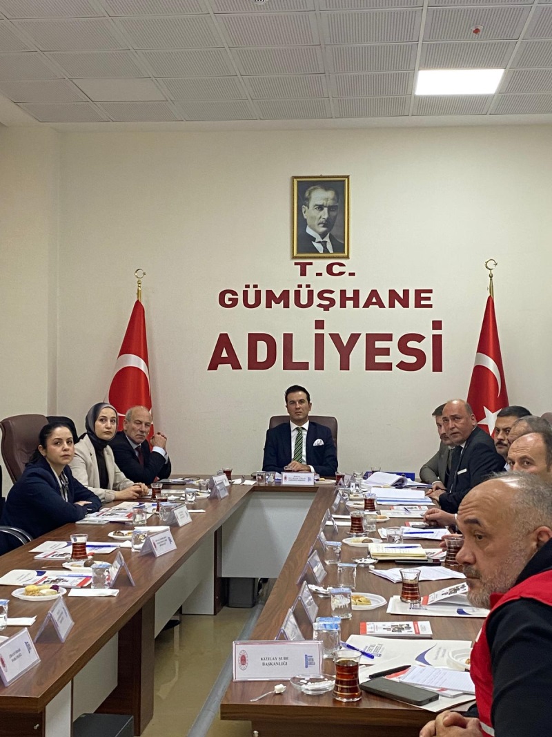 Gümüşhane Cumhuriyet Başsavcılığı Koruma Kurulu toplantısı gerçekleştirildi. Gümüşhane Cumhuriyet Başsavcılığı Koruma Kurulu 2025 yılı 4. toplantısı Gümüşhane Adalet Sarayı toplantı salonunda Gümüşhane Cumhuriyet Başsavcısı Sayın Ziya Burak Gürgah başkanlığında yapıldı. Gümüşhane Cumhuriyet Başsavcısı Sayın Ziya Burak Gürgah'ın açılış konuşması ile başlanılan toplantıda kurul üyelerine müdürlüğümüz tarafından gerçekleştirilen faaliyetler hakkında bilgi verildi. Denetimli Serbestlik Sisteminin 20. yıl dönümü dolayısıyla, sistemin tanıtımı ve bilinirliğini artırmak amacıyla kapsamlı bilgilendirme yapıldı. Kurul üyelirinin yapılması planlanan faaliyetler hakkında görüş ve önerileri alınarak toplantı sonlandırıldı.